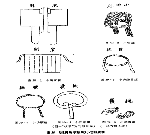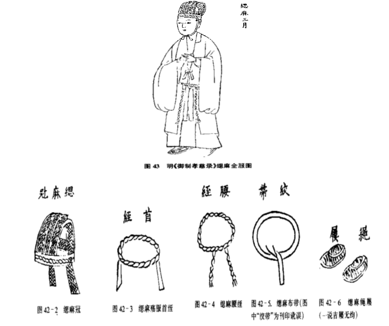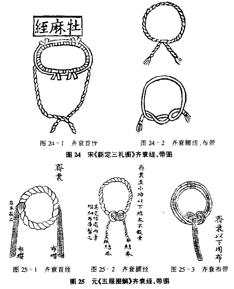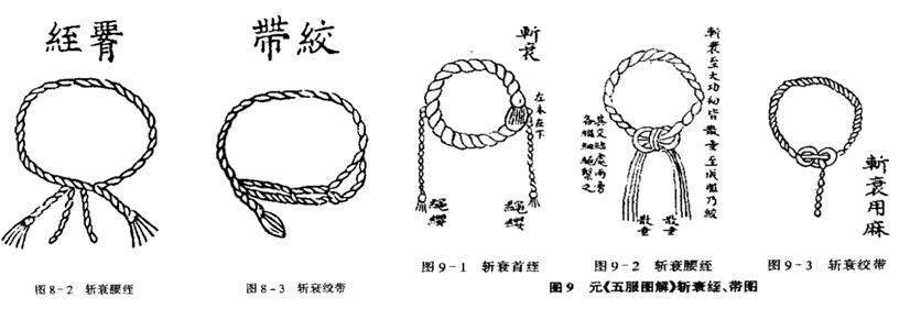 除斩衰服外,服丧者还要在头上、腰上绑扎用麻制成的麻绳带,分别谓之首绖、腰绖。历代也多有差异: